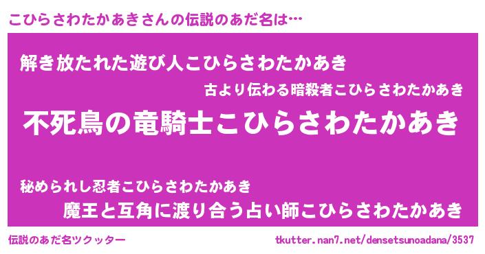 | ヒーロー風カッコイイあだ名 | 『スーパーコヒラサワタカアキ』 |