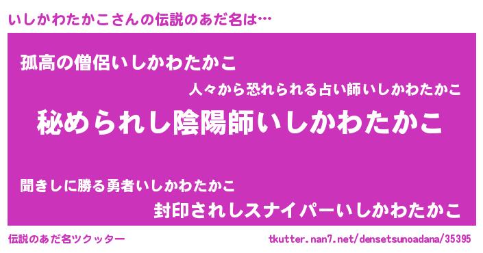 | 女子向けラノベタイトル風あだ名 | 『いしかわたかこが死なない童話 林檎のいしかわたかこの診療簿』 |