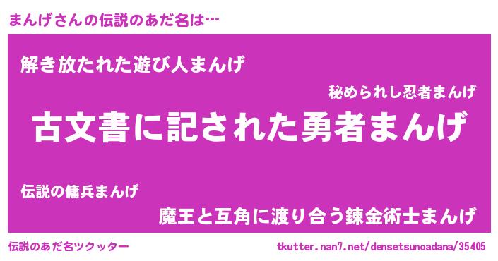 | 男性向けラノベタイトル風あだ名 | 『この素晴らしい世界にまんげを!』 |