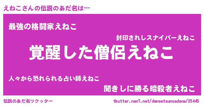 | 男性向けラノベタイトル風あだ名 | 『Re:えねこから始める異世界生活』 |