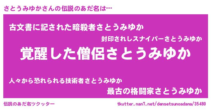 | 男性向けラノベタイトル風あだ名 | 『さとうみゆかの嫁は女の子じゃないと思った?』 |