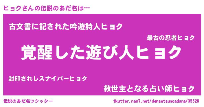 | 男性向けラノベタイトル風あだ名 | 『ヒョクの嫁は女の子じゃないと思った?』 |