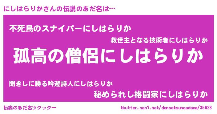 | 胡散臭い通販商品みたいなあだ名 | 『信頼と実績のネックレス…その名も「にしはらりか」』 |