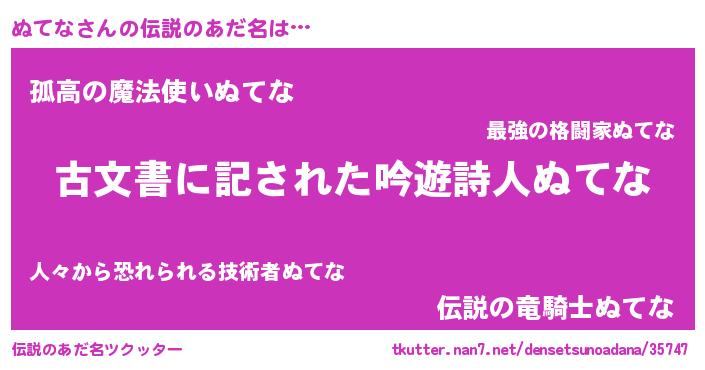 | 男性向けラノベタイトル風あだ名 | 『ぬてな~年齢イコール彼女いない歴の魔法使い~』 |