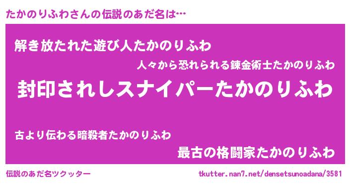 | 男性向けラノベタイトル風あだ名 | 『タカノリフワアートオンライン』 |