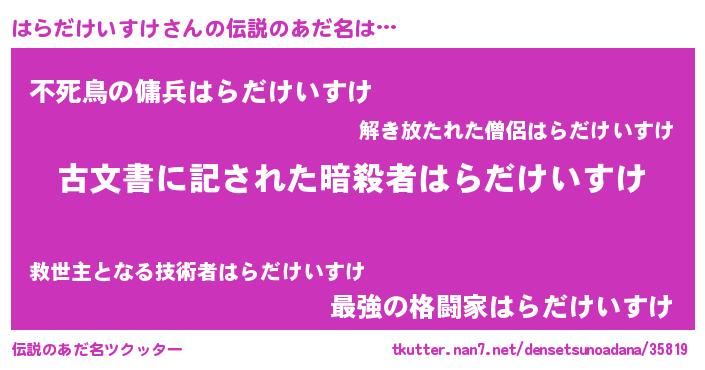 | 男性向けラノベタイトル風あだ名 | 『はらだけいすけに滅ぼされるだけの簡単なお仕事です』 |