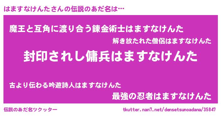 | 男性向けラノベタイトル風あだ名 | 『はますなけんた~年齢イコール彼女いない歴の魔法使い~』 |