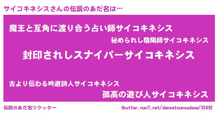 | 男性向けラノベタイトル風あだ名 | 『サイコキネシス~年齢イコール彼女いない歴の魔法使い~』 |