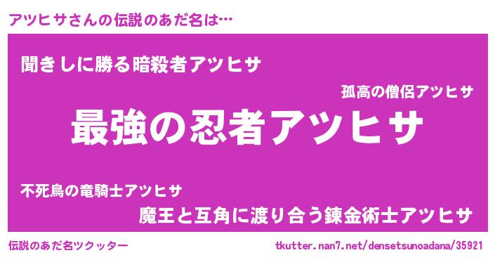 | 女子向けラノベタイトル風あだ名 | 『アツヒサの婚約者』『アツヒサ恋絵巻』 |