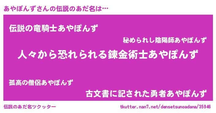 | 男性向けラノベタイトル風あだ名 | 『おまえをオタクにしてやるから、俺をあやぽんずにしてくれ! 』 |