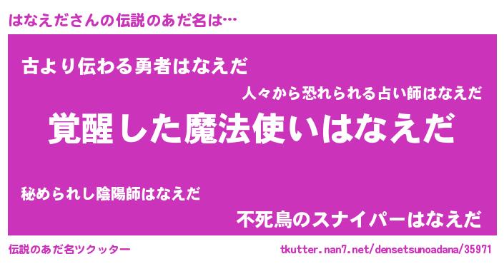 | 男性向けラノベタイトル風あだ名 | 『はなえだの嫁は女の子じゃないと思った?』 |