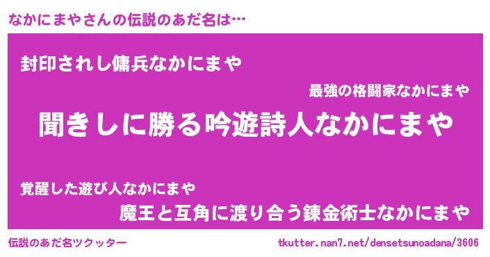| 男性向けラノベタイトル風あだ名 | 『なかにまやという概念が存在しない退屈な世界 』 |