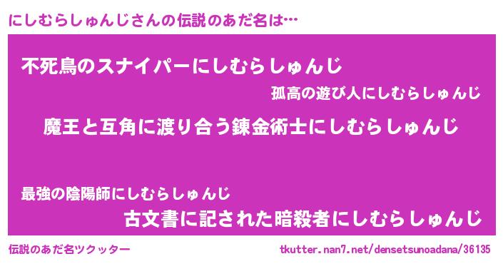 | 男性向けラノベタイトル風あだ名 | 『転生したらにしむらしゅんじだった件』 |