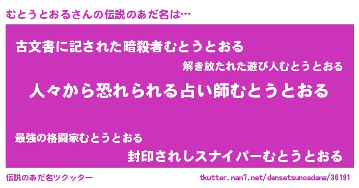 | 意味不明あだ名 | 『住所不定無職むとうとおる(62歳)』 |