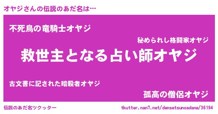 | 男性向けラノベタイトル風あだ名 | 『オヤジ~年齢イコール彼女いない歴の魔法使い~』 |
