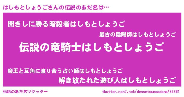| 女子向けラノベタイトル風あだ名 | 『はしもとしょうごが死なない童話 林檎のはしもとしょうごの診療簿』 |
