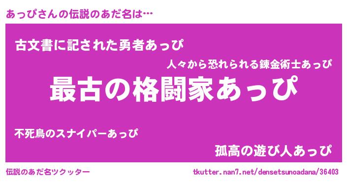 | ヒーロー風カッコイイあだ名 | 『ウルトラあっぴマン』『最強戦士アッピ』 |
