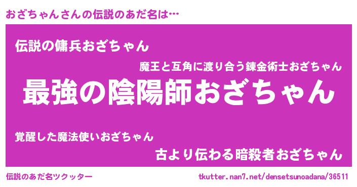 | 男性向けラノベタイトル風あだ名 | 『おざちゃん~年齢イコール彼女いない歴の魔法使い~』 |