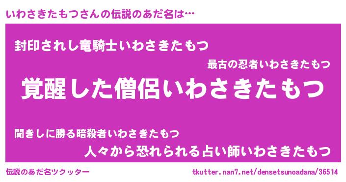 | 男性向けラノベタイトル風あだ名 | 『いわさきたもつに滅ぼされるだけの簡単なお仕事です』 |