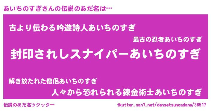 | 男性向けラノベタイトル風あだ名 | 『あいちのすぎ~年齢イコール彼女いない歴の魔法使い~』 |