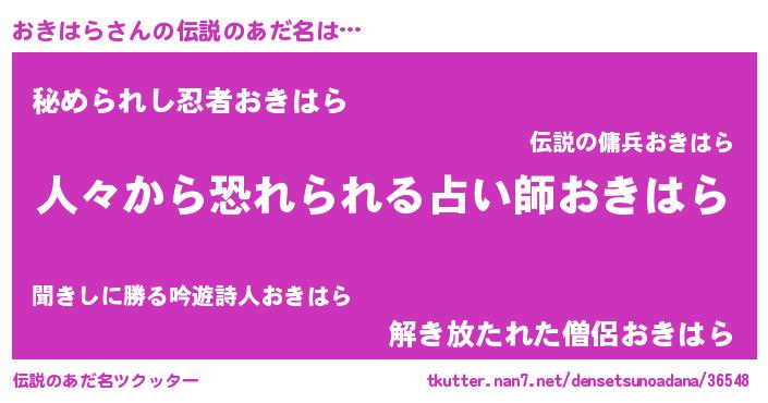 | ヒーロー風カッコイイあだ名 | 『正義の使者おきはら』『天弓騎士オキ』 |