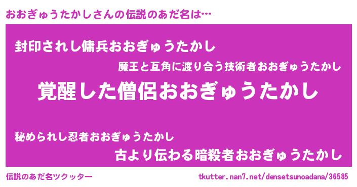 | 男性向けラノベタイトル風あだ名 | 『おおぎゅうたかしの嫁は女の子じゃないと思った?』 |