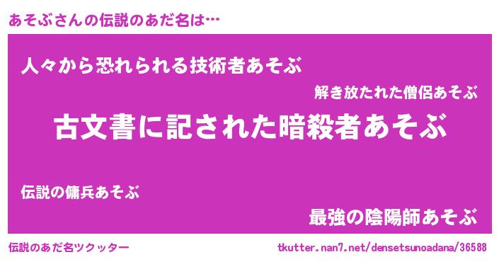 | 男性向けラノベタイトル風あだ名 | 『あそぶ~年齢イコール彼女いない歴の魔法使い~』 |