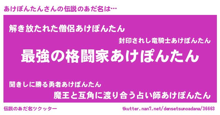 | 男性向けラノベタイトル風あだ名 | 『うちのあけぽんたんが世界を掌握している!』 |