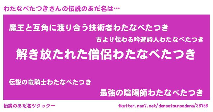 | ポケモン風あだ名 | 『ヒワタナベタツキ』『ワックウザ』 |