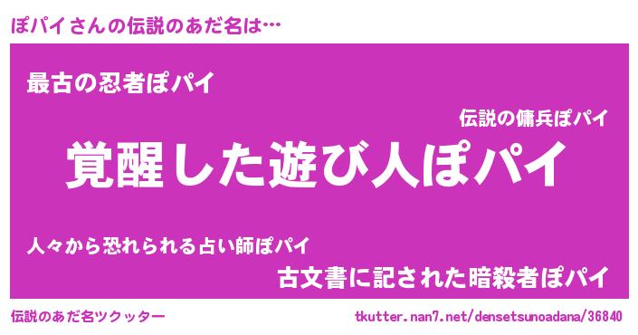 | 男性向けラノベタイトル風あだ名 | 『ぽパイ~年齢イコール彼女いない歴の魔法使い~』 |