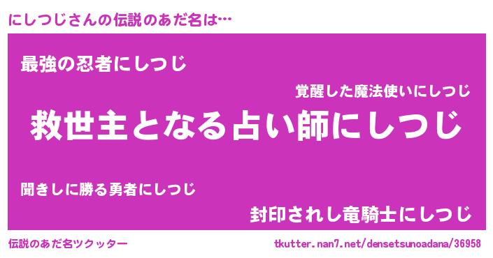 | 意味不明あだ名 | 『ヨモギ科にしつじ属』『自称にしつじ』 |