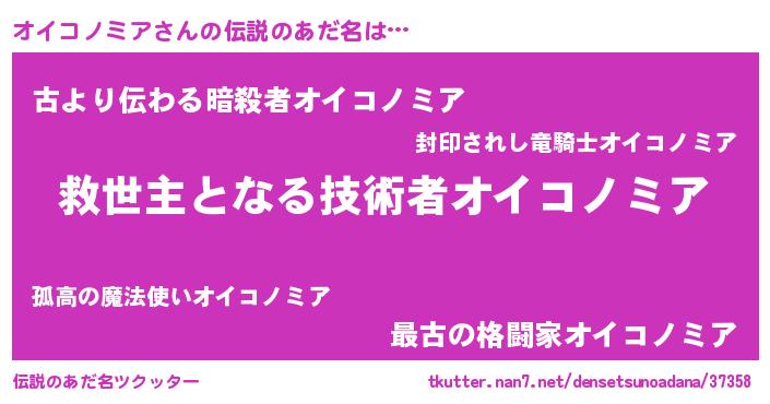 | 男性向けラノベタイトル風あだ名 | 『オイコノミア~年齢イコール彼女いない歴の魔法使い~』 |