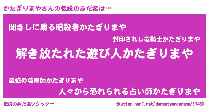 | 男性向けラノベタイトル風あだ名 | 『かたぎりまやの嫁は女の子じゃないと思った?』 |