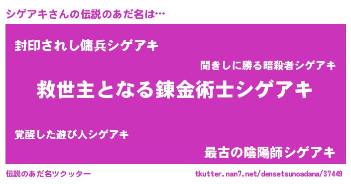 | 男性向けラノベタイトル風あだ名 | 『ノーゲーム・ノーシゲアキ』 |