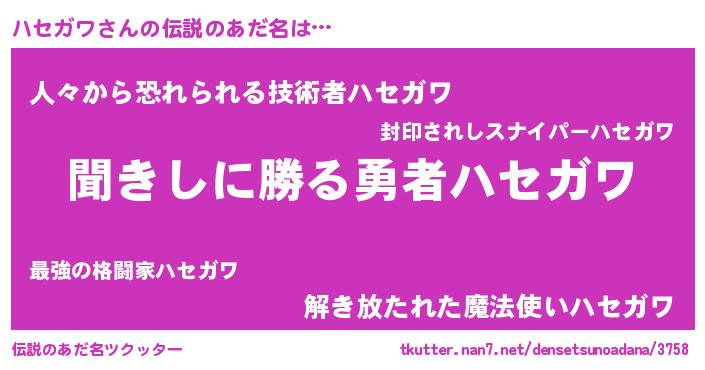 | 男性向けラノベタイトル風あだ名 | 『ハセガワという概念が存在しない退屈な世界 』 |