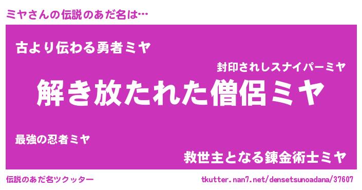 | ヒーロー風カッコイイあだ名 | 『銀牙騎士ミヤ』『ネオミヤ』 |