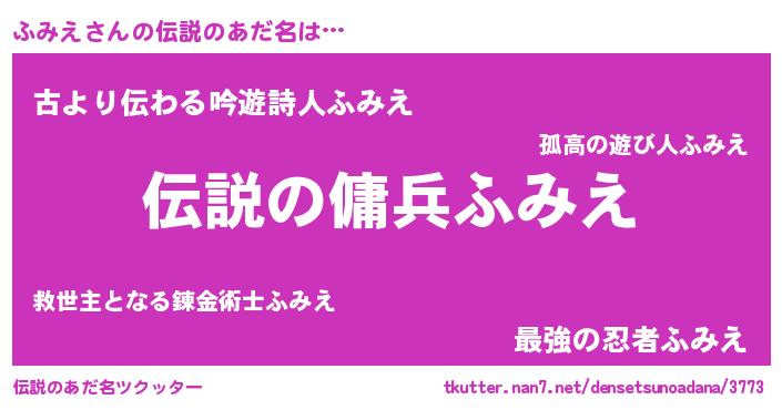 | ヒーロー風カッコイイあだ名 | 『超時空戦士フミエ』『スーパーフミエ』 |