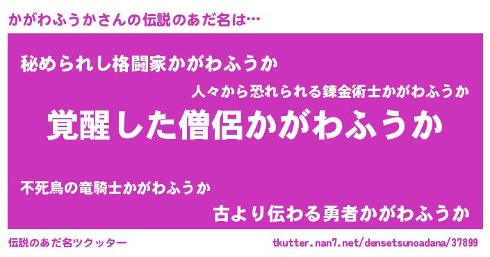 | 男性向けラノベタイトル風あだ名 | 『かがわふうか~年齢イコール彼女いない歴の魔法使い~』 |