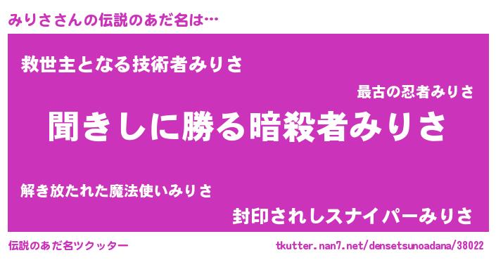| 男性向けラノベタイトル風あだ名 | 『みりさという概念が存在しない退屈な世界 』 |