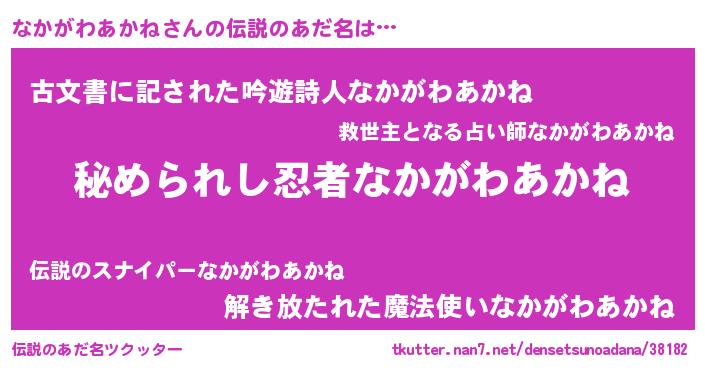 | 男性向けラノベタイトル風あだ名 | 『やはりなかがわあかねの青春ラブコメはまちがっている 』 |