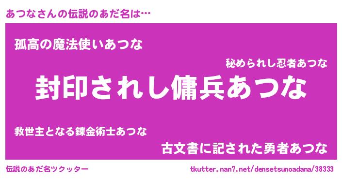 | 女子向けラノベタイトル風あだ名 | 『あつなの玉の輿計画!』 |