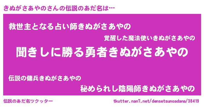 | ヒーロー風カッコイイあだ名 | 『ネオキヌガサアヤノ』『暗黒騎士キヌ』 |