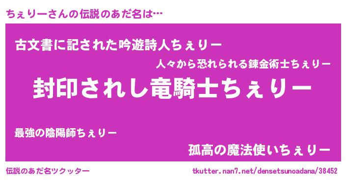 | 男性向けラノベタイトル風あだ名 | 『ちぇりー~年齢イコール彼女いない歴の魔法使い~』 |