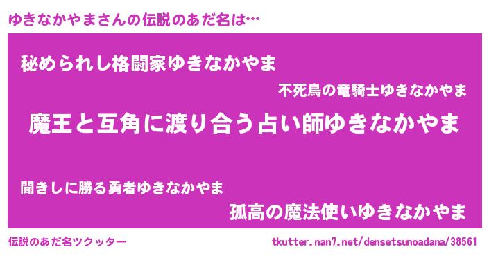 | 男性向けラノベタイトル風あだ名 | 『おまえをオタクにしてやるから、俺をゆきなかやまにしてくれ! 』 |