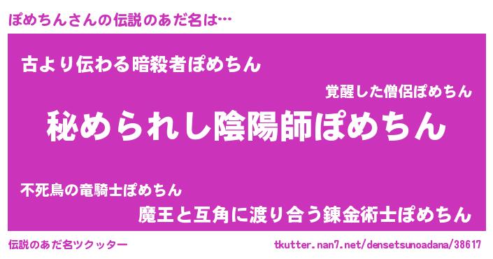 | 男性向けラノベタイトル風あだ名 | 『魔弾の王とぽめちん』 |