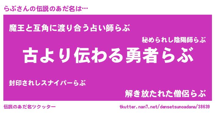 | ヘコむあだ名 | 『らぶ(震え声)』『らぶ太郎』『豆乳』 |