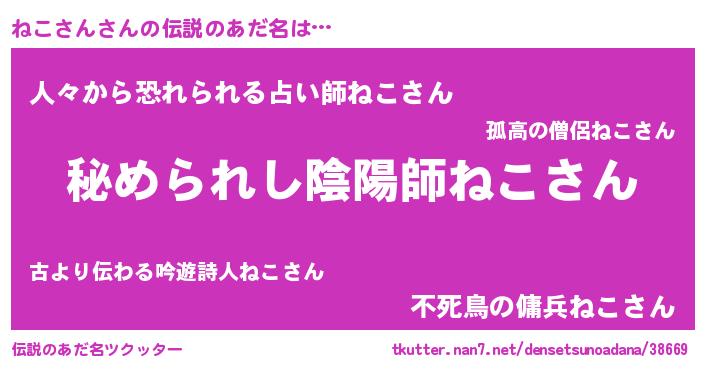 | 男性向けラノベタイトル風あだ名 | 『ネコサンスレイヤー』 |