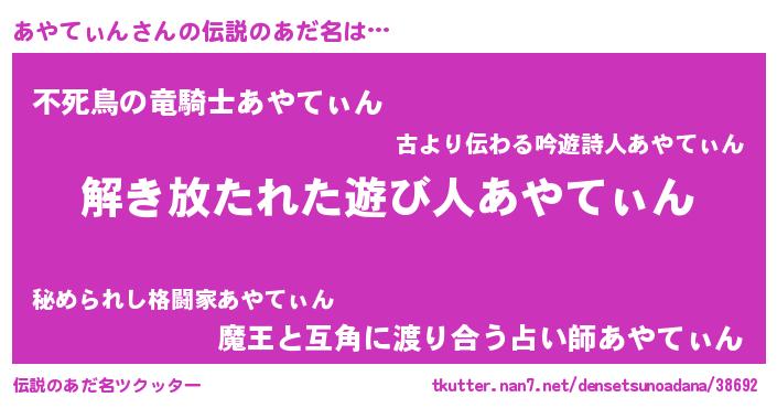 | 男性向けラノベタイトル風あだ名 | 『ダンジョンにあやてぃんを求めるのは間違っているだろうか』 |