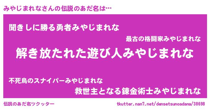 | 女子向けラノベタイトル風あだ名 | 『みやじまれなの卵を拾いまして』 |