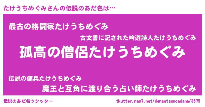 | ヒーロー風カッコイイあだ名 | 『暗黒騎士タケ』『ネオタケウチメグミ』 |